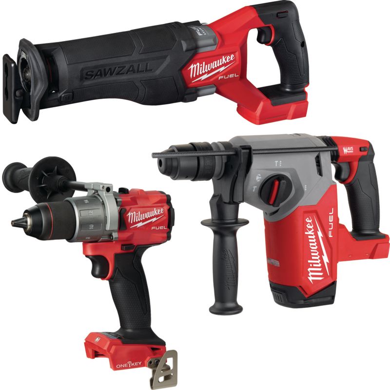 Promotions-Set mit Akku-Säbelsäge, Akku-Bohrschrauber und Akku-Kombihammer von MILWAUKEE. Alle Elektrowerkzeuge in HD-Transportboxen inklusive passenden Akkus, Ladegerät, Wasserwaage und Bandmass.